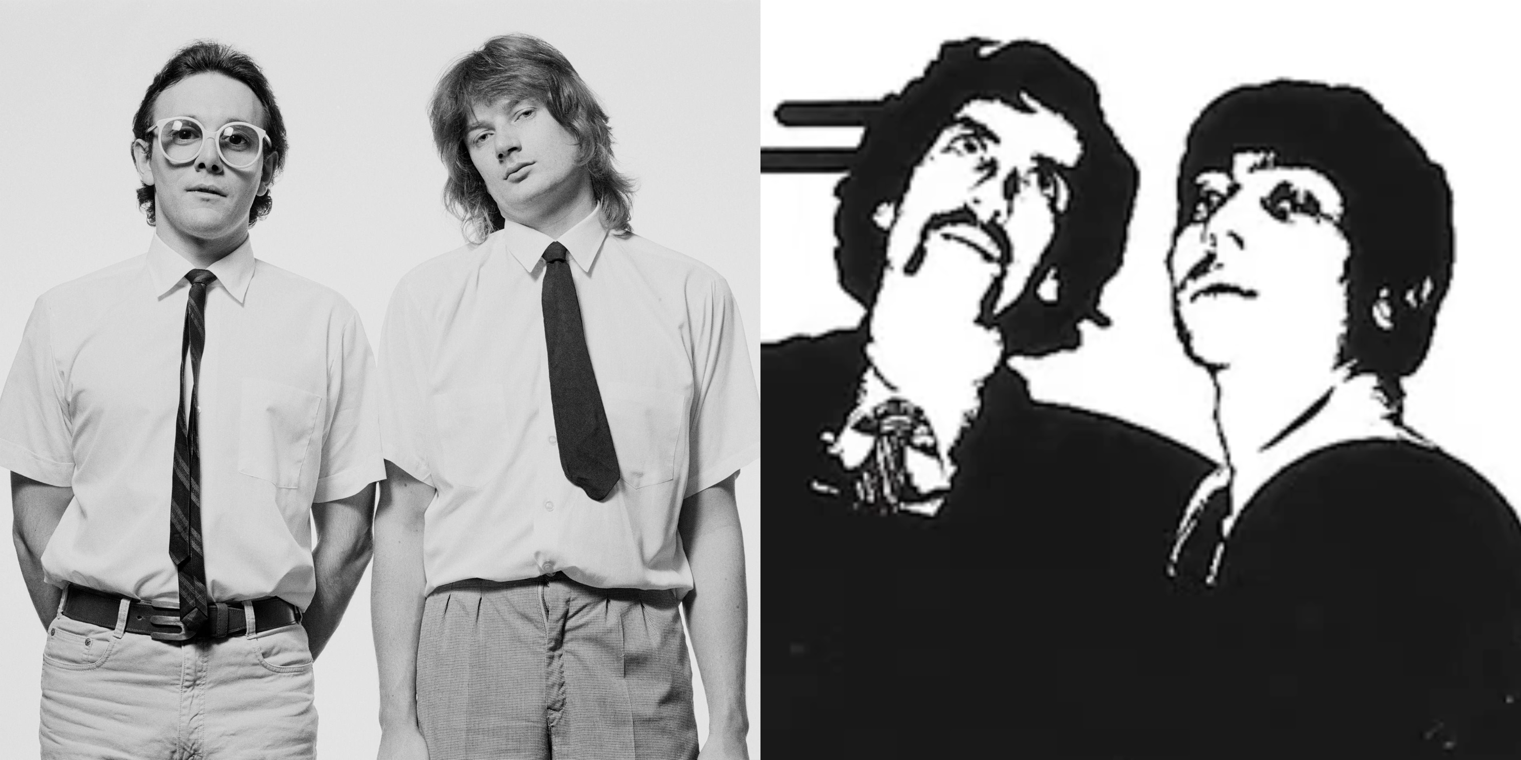 Left : Trevor Horn and Geoff Downes photographed by Fin Costello, 1979. Right : Gaspard Augé and Xavier de Rosnay for Musclorvision : Hits Up To You, 2003.